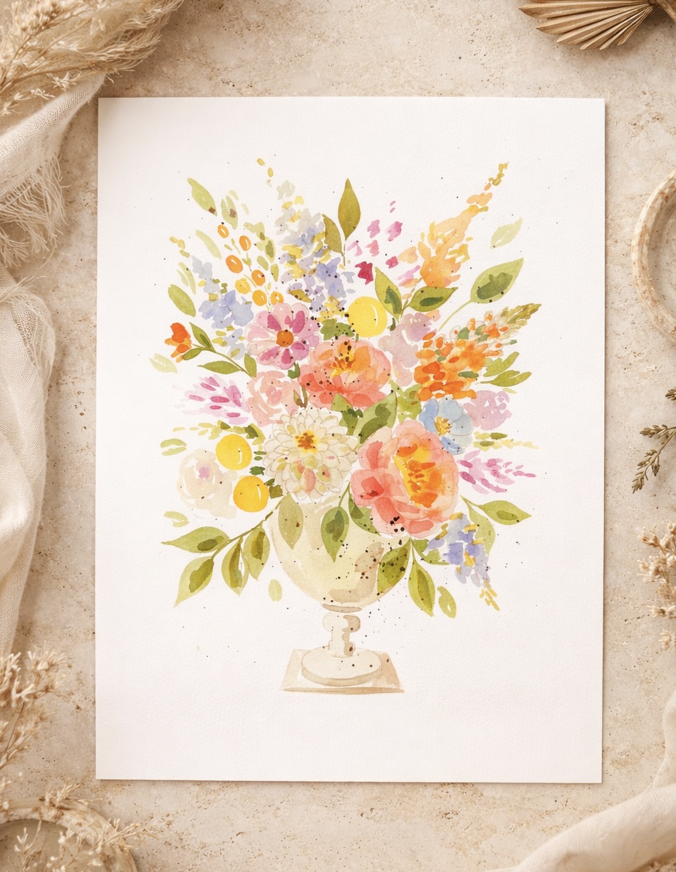 Damit du entspannt starten kannst, sind einige feine Linien bereits vorgedruckt. Schritt für Schritt zeige ich dir, wie wir den Strauß aufbauen, Farben harmonisch kombinieren und den typischen Aquarell-Look entstehen lassen – ganz ohne Vorkenntnisse.